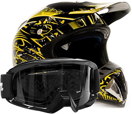 Adult Offroad Helmet & Goggles Gear Combo DOT Motocross ATV Dirt Bike MX Black Yellow Splatter ( Small )