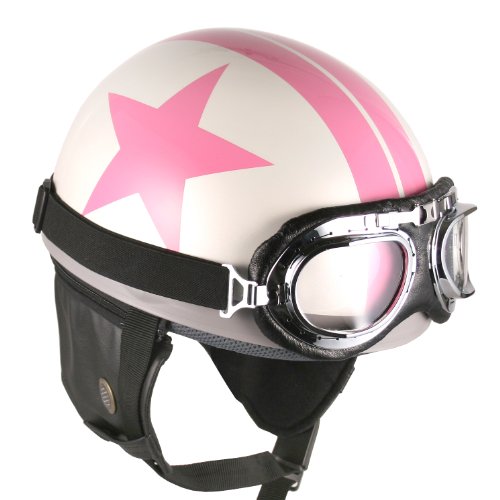 Goggles Vintage German Style Half Helmet (White Pink-star , Large) Motorcycle Biker Cruiser Scooter Touring Helmet